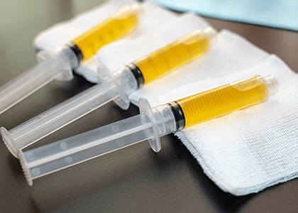 当院ではPRP治療を導入しています。PRP治療とはご自分の少量の血液を材料として専用容器に入れてから、遠心分離機に複数回かけることで血小板/成長因子を5〜8倍に濃縮し、患部に注入する治療です。(同じPRP治療であっても濃度によって効果が変わりますので注意が必要です)